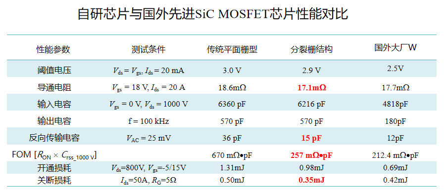 由于引入了场板分离型的分裂栅结构,芯片具有更低的反向传输电容(Crss),高频优值HF-FOM [RON × Crss]接近国外先进水平,较之传统平面栅结构器件指标数值明显改善。经电学特性测试结果显示5mm × 5mm的SiC MOSFET芯片导通电阻为17.1mΩ,与国际SiC龙头企业国外大厂W类似产品的导通电阻一致或略优。同时本次流片后的芯片总面积小于市场上同类产品(26mm2),能有效降低器件制造成本。在VDS=800V/IDS=50A的工况下实测发现本批次芯片开关性能有所提升,关断损耗为0.35mJ,在同一工况下比国外大厂W同类产品的关断损耗(0.42mJ)低17%,将有效提升电能变换效率,体现在如新能源汽车的下游应用中,将有助于提升电动汽车的续航里程。