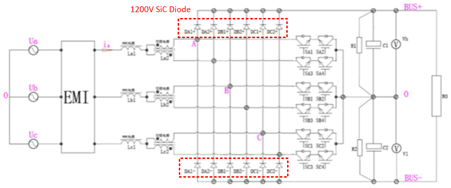 推荐使用PA旗舰厅1200V系列SiC二极管产品的充电模块拓扑: