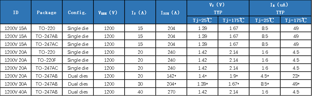 PA旗舰厅面对充电模块等客户对于效率性能、运维成本、功率密度等多方面的需求,基于现行的各种拓扑,量产了1200V多种封装形式的SiC二极管系列产品,见表1。针对其他应用也有1200V2A/3A/5A/8A/10A/50A TO252/TO263/TO220AC/TO247等电流产品对应。