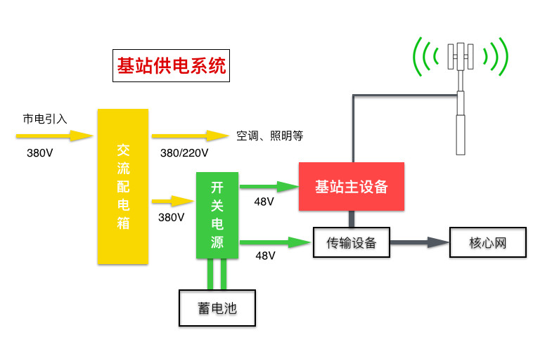 我们从基站原理说起。通常,基站的供电系统由市电引入,通过交流配电箱、开关电源转换为-48V直流后连接到基站设备,基站设备再通过馈线/光纤连接到铁塔上的天线。
